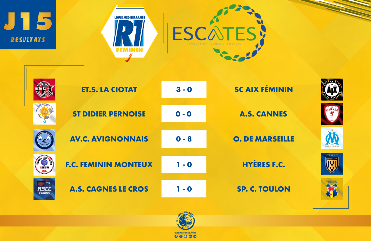 La 15ᵉ journée du Championnat R1 Féminin ESCATES a offert plusieurs enseignements ce week-end, avec notamment une démonstration de la réserve de l’Olympique de Marseille, toujours qui s’installe en tête du classement.