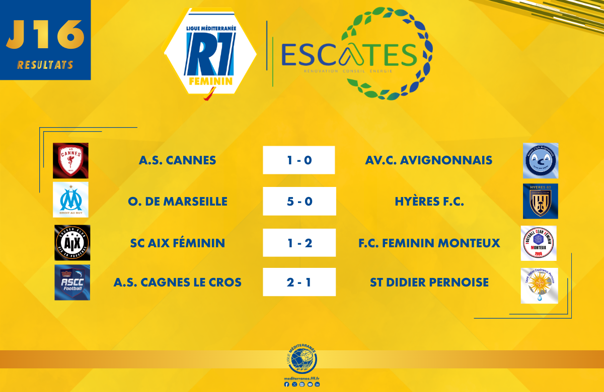 À l’issue de cet acte 16, l’Olympique de Marseille 2 continue de mener la danse en tête, tandis que la bataille reste très serrée derrière entre Saint-Didier Pernoise, AS Cagnes-le-Cros et FC Féminin Monteux dans ce championnat R1 Féminin ESCATES toujours aussi disputé.