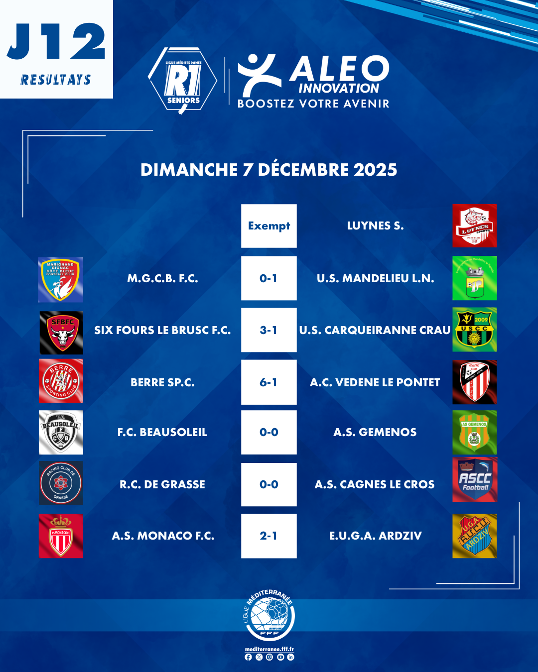 Mandelieu, invaincu depuis le 26 octobre, est également dans le rythme (1-0 chez Marignane Gignac) alors que Gémenos fait actuellement du surplace (3ème nul d’affilée, 0-0 à Beausoleil). Luynes était l’exempt de cette 12ème journée.