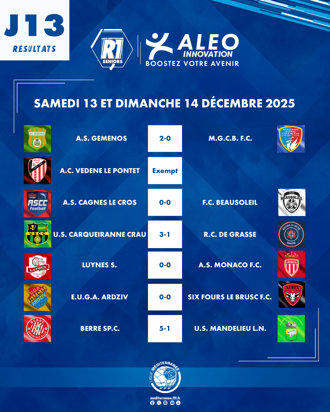 Trois équipes composent la meute des poursuivants : Gémenos, vainqueur de Marignane Gignac (2-0), Cagnes Le Cros et Monaco auteurs d’un nul respectivement face à Beausoleil (0-0) et à Luynes (0-0).